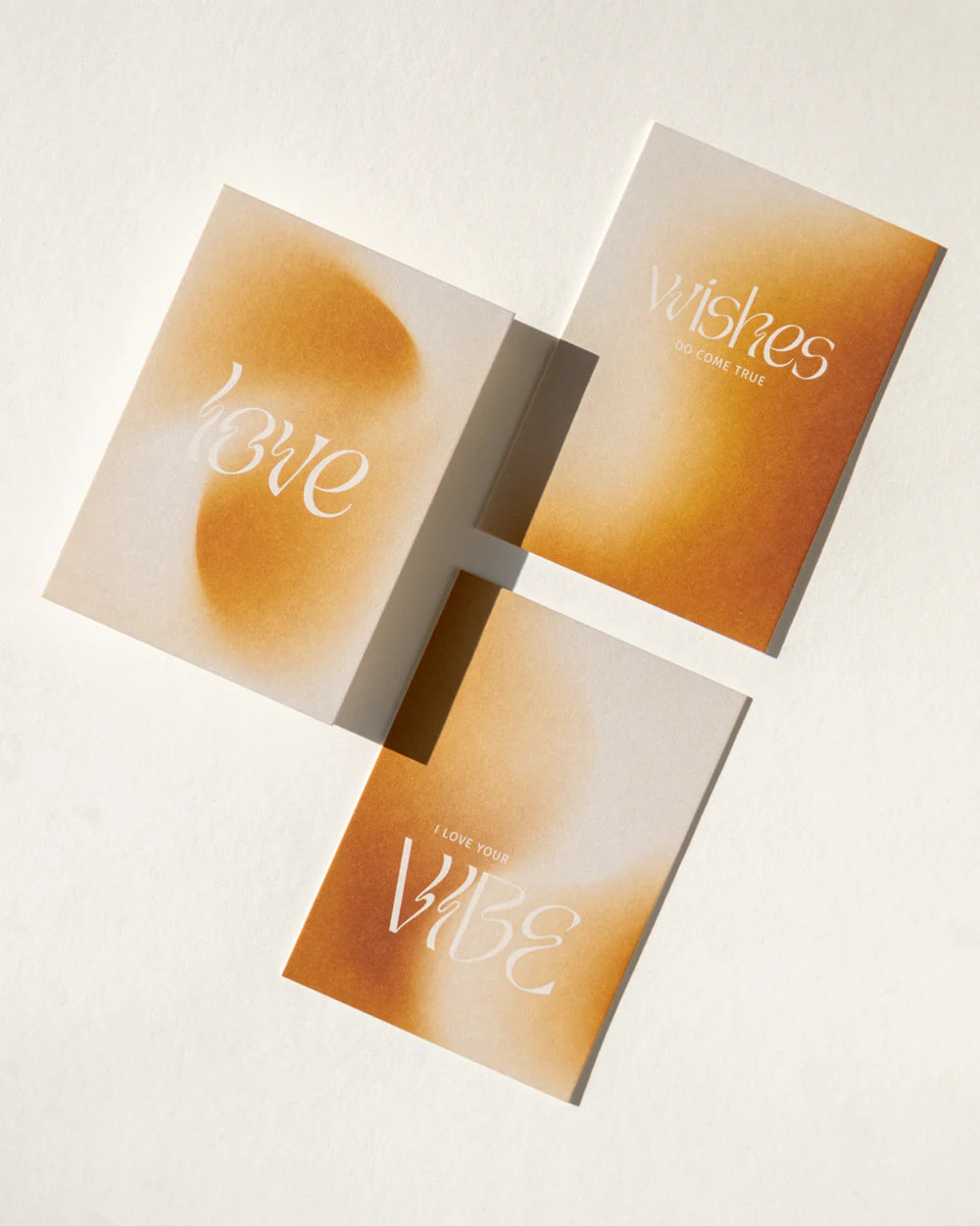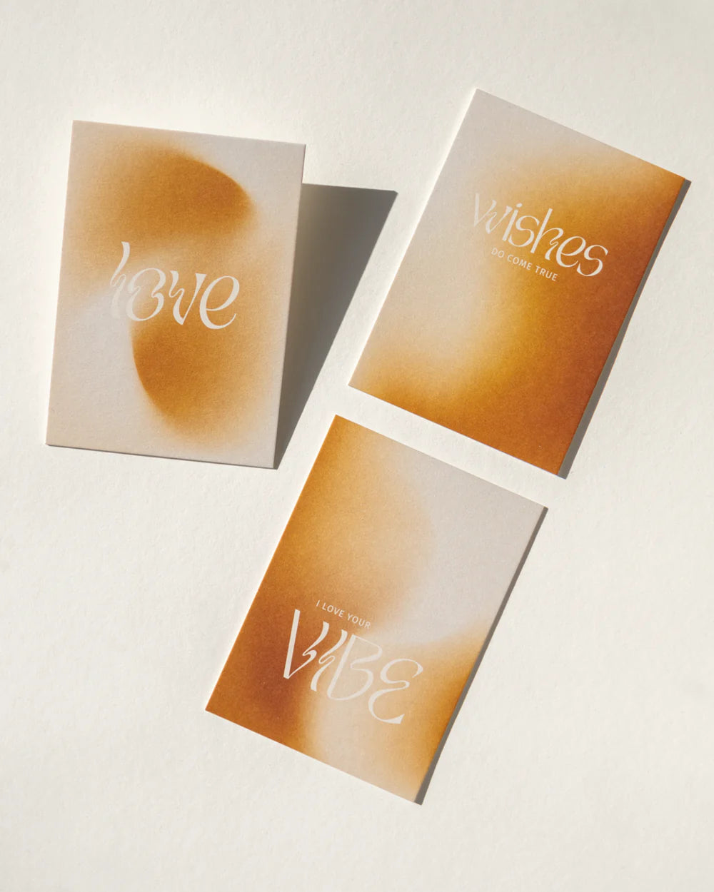 Versprühe positive Energie mit den HIGHER VIBES Postkarten! Drei inspirierende Botschaften – „Wishes do come true“, „I love your vibe“ und „LOVE“ – bringen Freude und Motivation in deinen Alltag. Ob als Geschenk, Blickfang auf dem Visionboard oder tägliche Erinnerung an deine Schöpferkraft, diese hochwertigen Postkarten aus nachhaltiger Holzschliffpappe fühlen sich wunderbar an und verbreiten liebevolle Vibes. Lass dein Umfeld lächeln und strahle gute Laune aus! Jede Karte ist auch einzeln erhältlich.